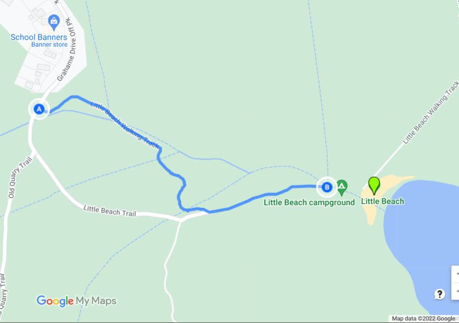 Access: Must walk 750 m on a bush trail from Grahame Dr to Little Beach. It’s easy.